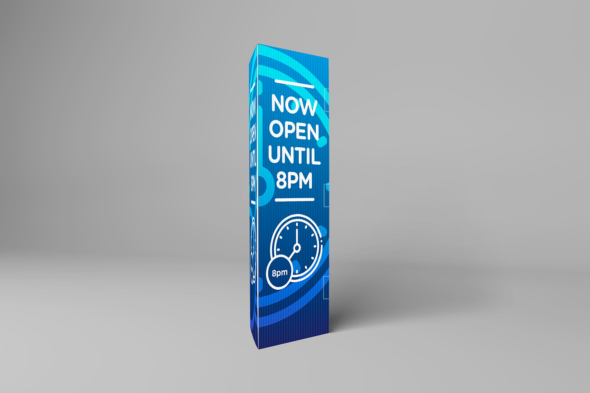 Bollard Covers offer an eye-catching display option perfect for advertising your client’s store promotions. Their striking design makes them ideal for increasing visibility and attracting customers in various locations, plus they’re lightweight and durable, making them suitable for short to medium-term signage.